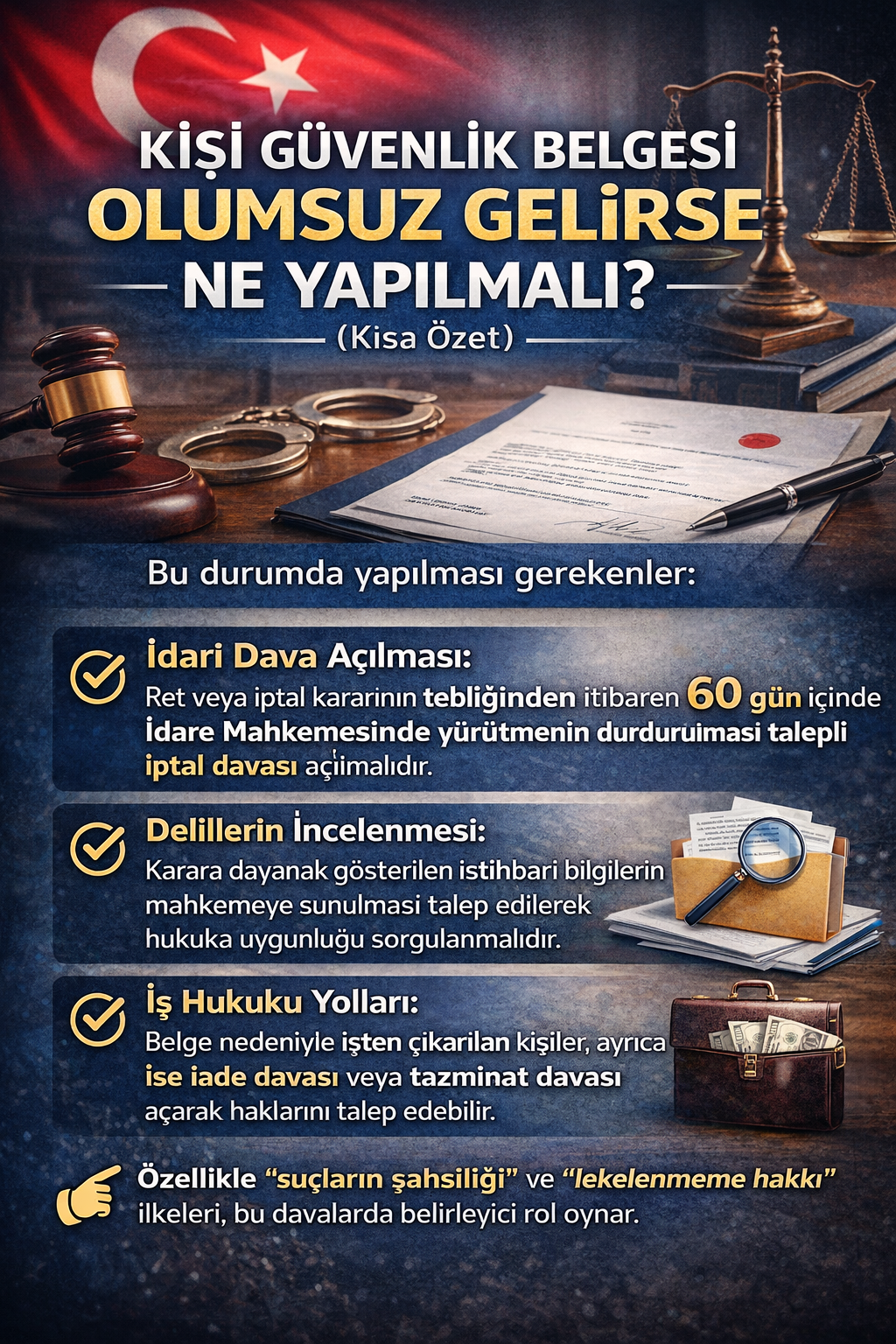 İdarenin, somut bir delile dayanmadan veya güncel olmayan istihbari şüpheler (örneğin akraba sicilinin olumsuzluğu) üzerinden verdiği ret kararlarına karşı, idari işlemin kişiye tebliğinden itibaren 60 günlük hak düşürücü süre içerisinde İdare Mahkemelerinde iptal davası açılmalıdır. Telafisi imkansız zararların ve maddi hak kayıplarının önüne geçebilmek adına, bu davaların mutlaka “yürütmenin durdurulması” talebiyle açılması gerekmektedir. Dava aşamasında kurumun sunduğu “gizli” istihbari raporların mahkemeye celbinin istenmesi ve bu iddiaların profesyonel bir idari dava avukatı aracılığıyla Anayasa Mahkemesi ile Danıştay’ın “suçların şahsiliği” ve “lekelenmeme hakkı” ilkeleri çerçevesinde çürütülmesi, davanın başarıya ulaşmasında kritik bir rol oynar. Ayrıca kişi güvenlik belgesi eksikliği nedeniyle sözleşmesi feshedilen çalışanların, bu idari davanın yanında İş Mahkemelerinde işe iade davası veya tam yargı davası açarak yoksun kaldıkları haklarını talep etmeleri mümkündür.